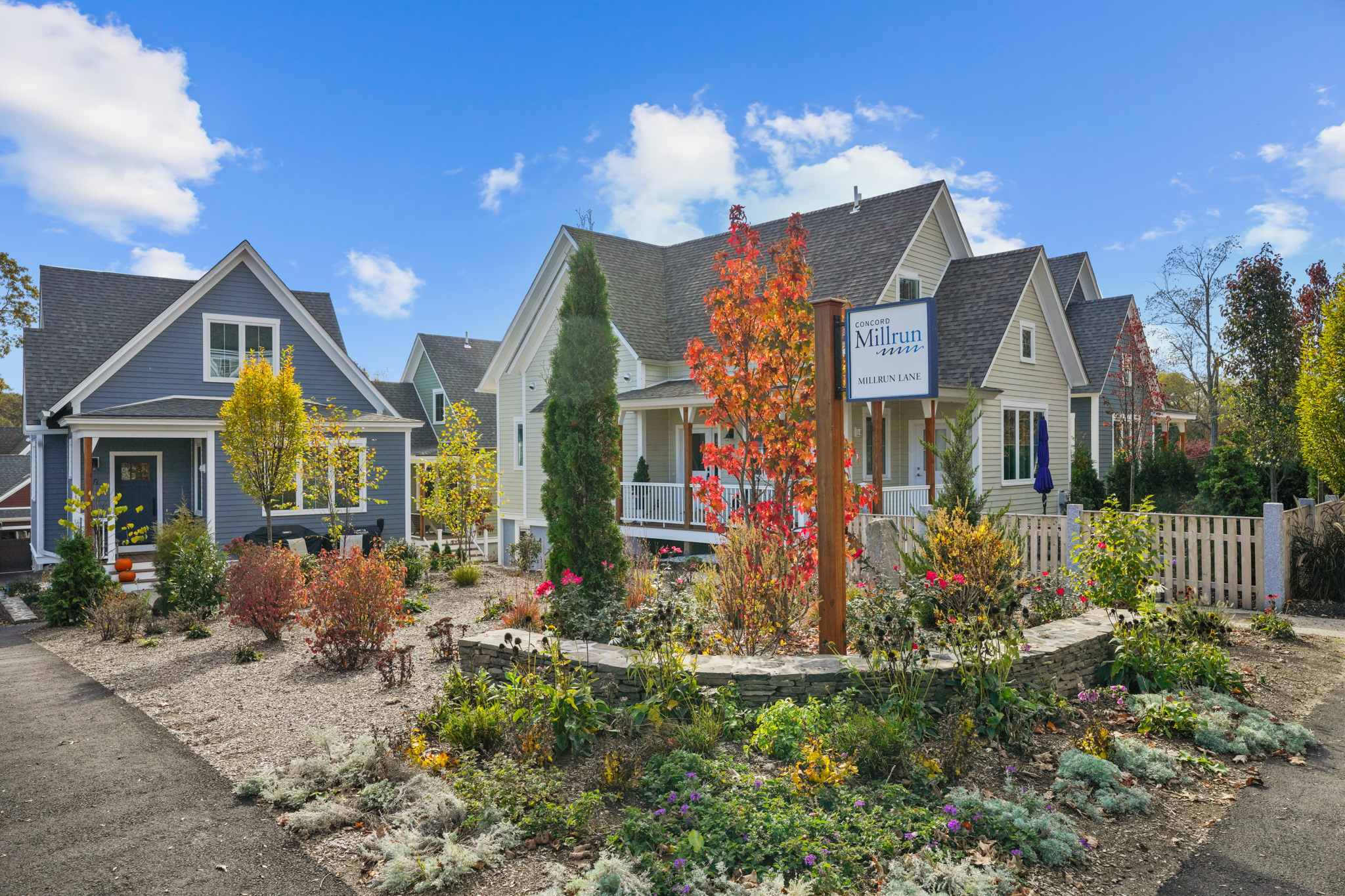 Concord Millrun is a new compact neighborhood that celebrates sustainable, communal living. Situated adjacent to preserved land and the natural beauty of the Assabet and Concord Rivers, the community features winding footpaths, inviting porches, and a central green that together create an intimate neighborhood fostering connection with nature and neighbors.