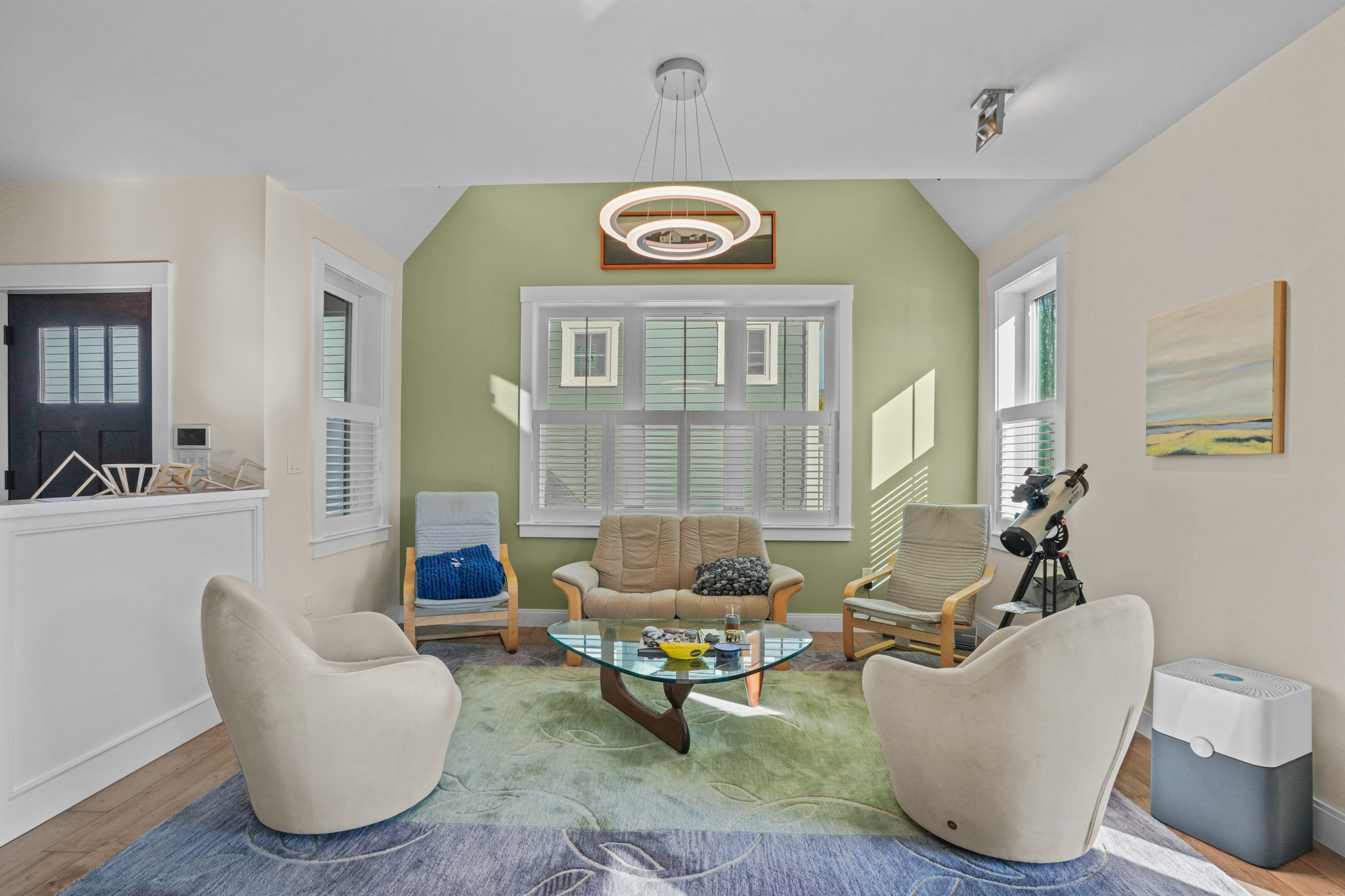 The site plan carefully staggers the alignment of each home and features floorplans that respond to adjacent homes to maximize privacy, natural interior light, and views of the common areas and green space.