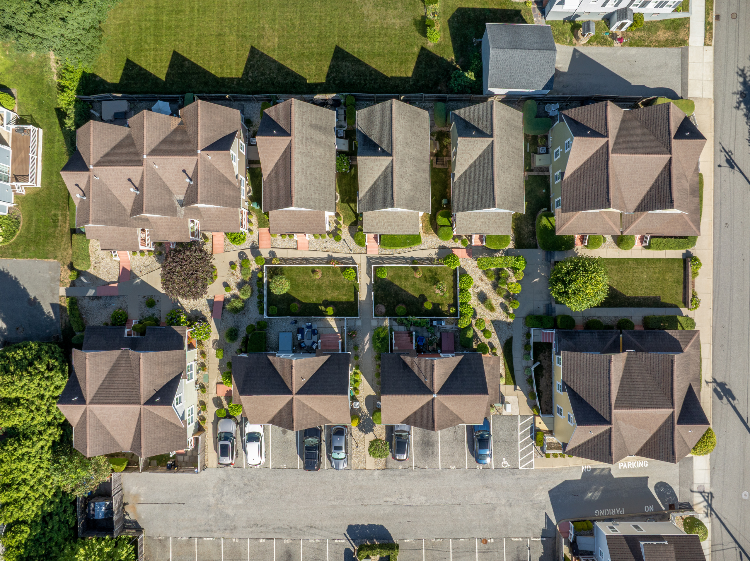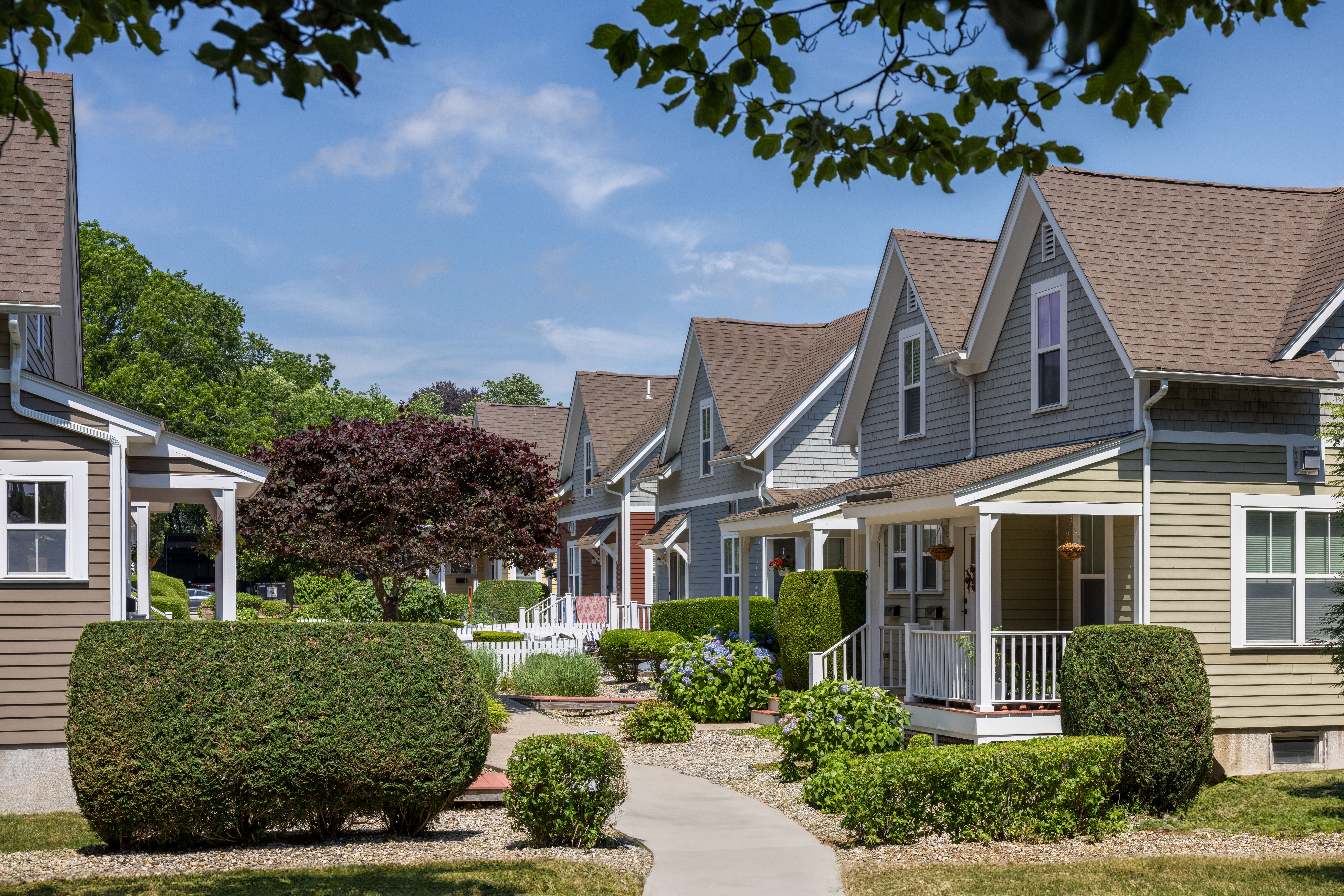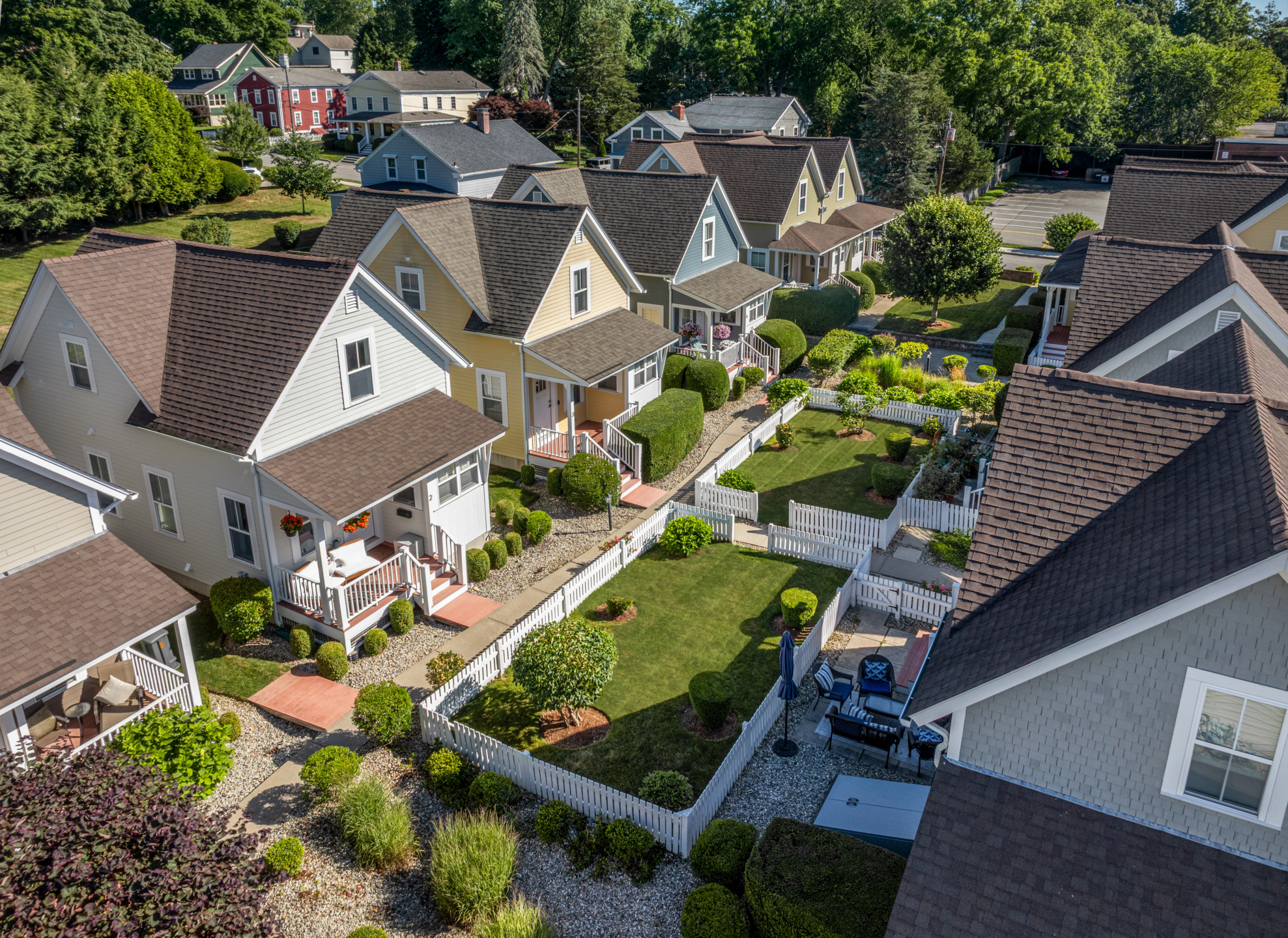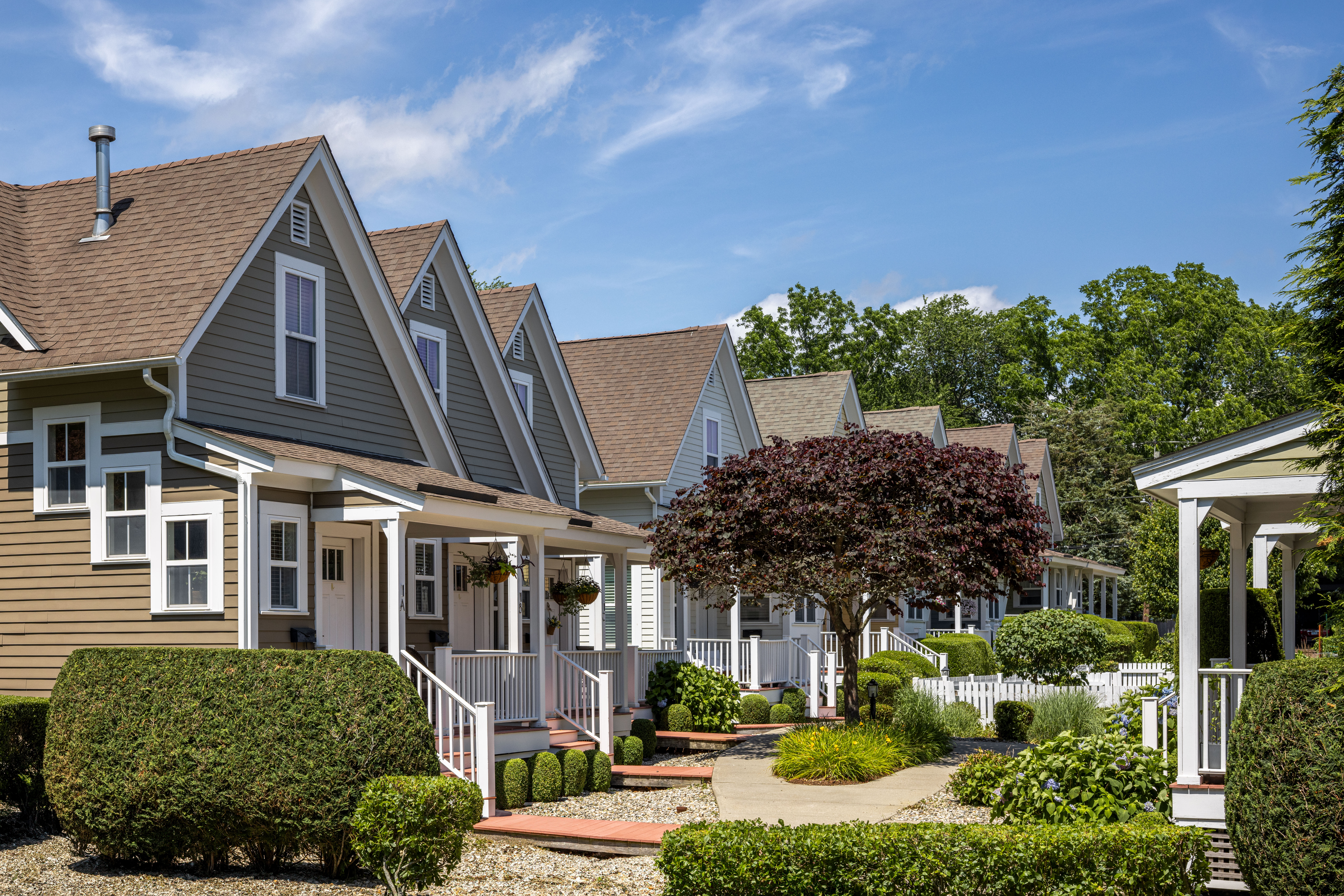 Located in the waterfront town of East Greenwich, these mixed-income condominiums are organized into a compact cottage court development. Although it appears to be a cluster of 1 1/2-story free-standing cottages, they are a mix of free-standing single units, attached duplexes, and a three-unit townhouse. This range of unit sizes was selected to provide attainable housing for new and existing residents looking for walkability and proximity to the bustling main street just blocks away.