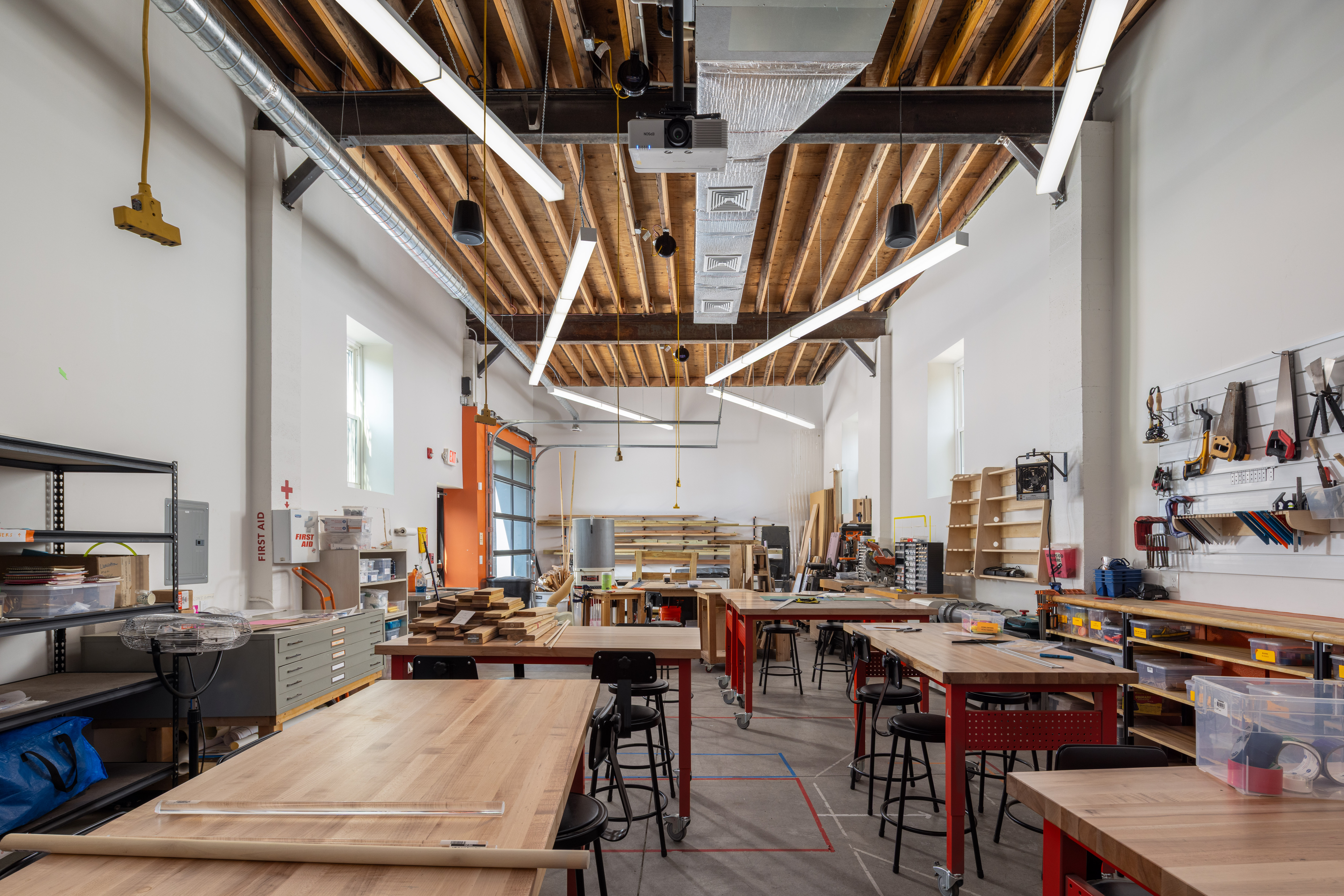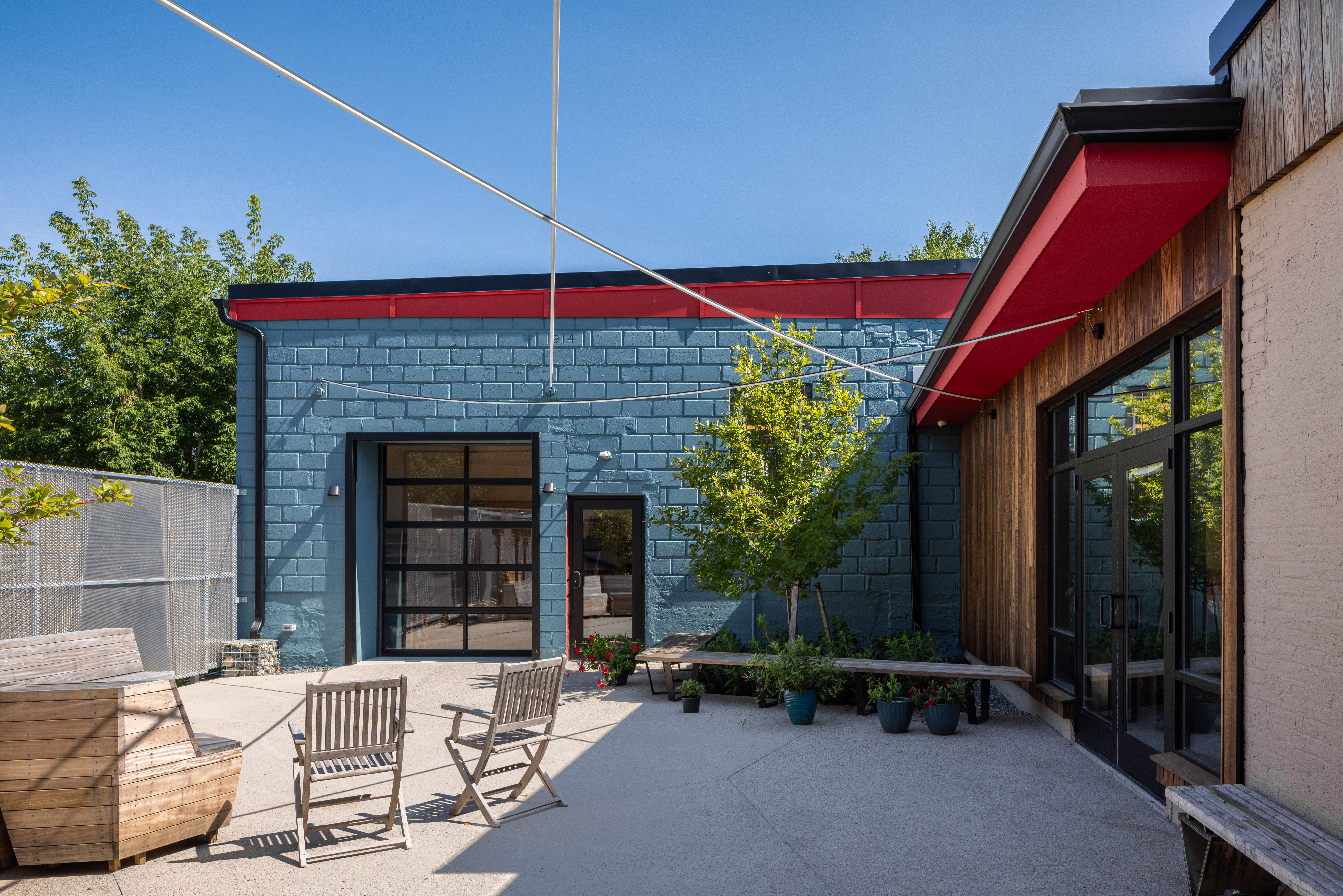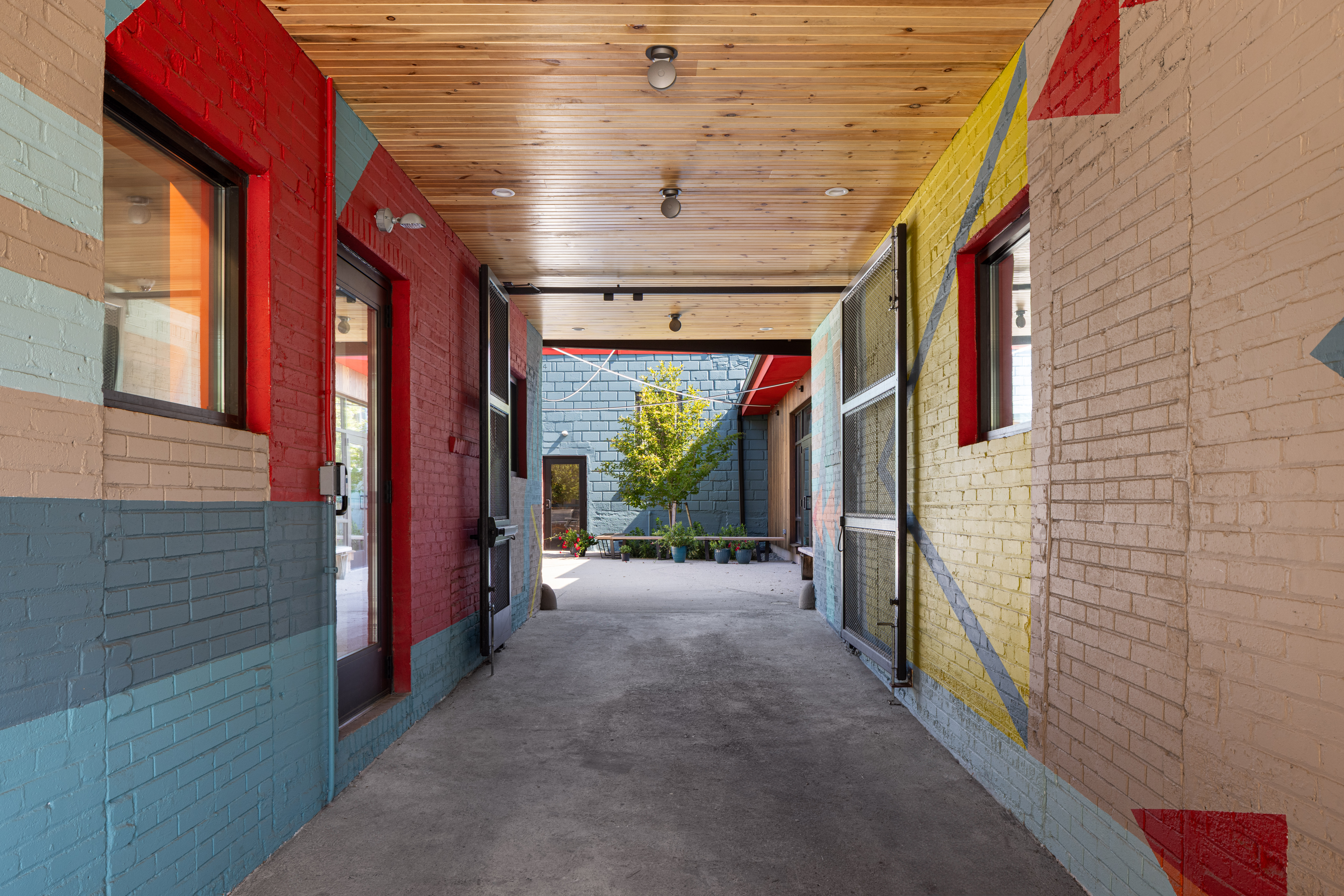 At the center of the studio is a reimagined courtyard, once a utilitarian loading dock, now a lively gathering space framed by classrooms, workshops, and offices. Visitors are drawn in through a breezeway featuring a colorful mural and dramatic lighting, leading to a space alive with light and activity. The project’s boldest move—unifying four buildings with varying floor levels into a seamless, barrier-free campus—ensures accessibility while creating an inspiring environment for collaboration and connection.