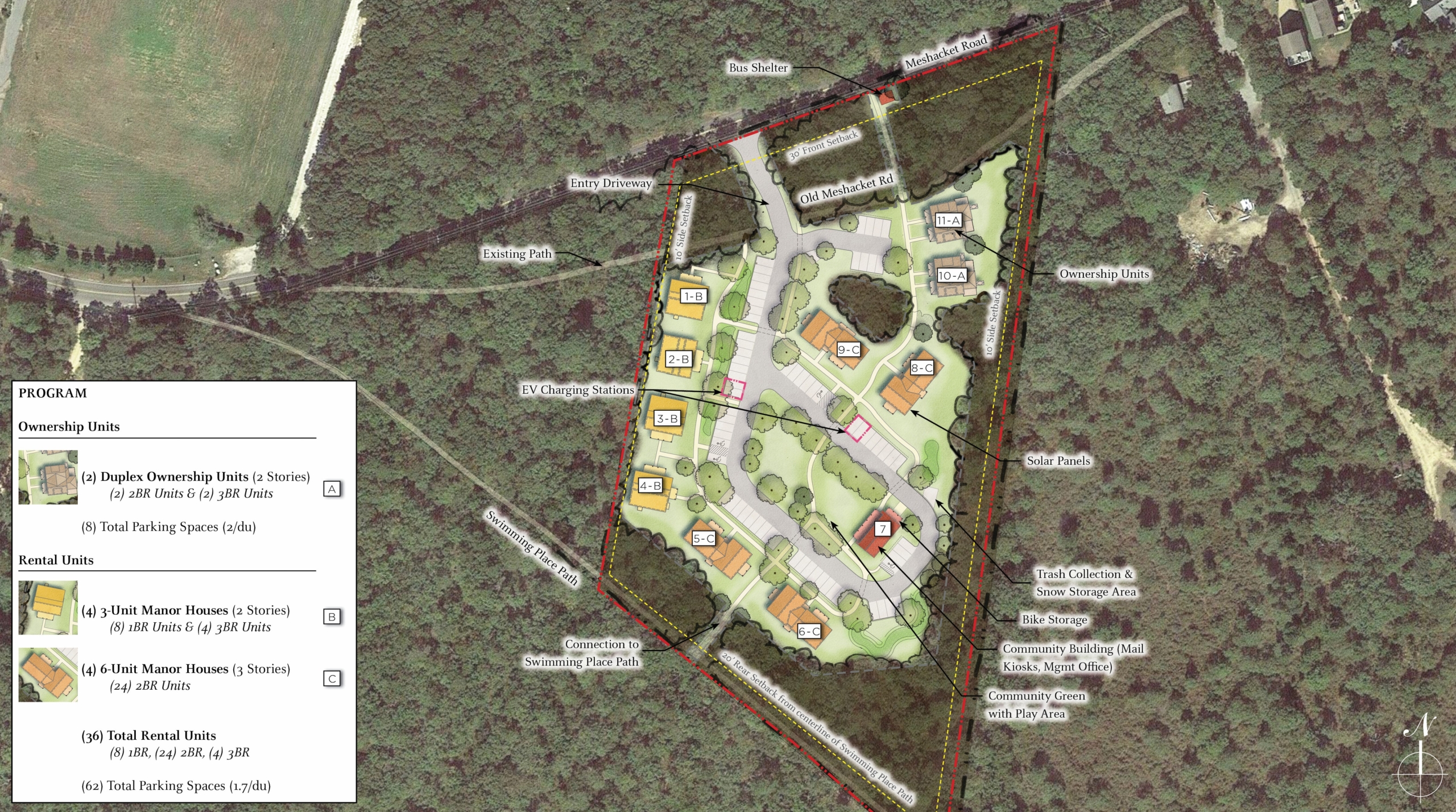 Edgartown on Martha’s Vineyard in Massachusetts is among many popular tourist communities on the Cape and Islands that continue to experience an increasing dearth of affordable and attainable housing options for its year-round population. Where median home prices reach $1.45 million, Meshacket Commons transforms a 6.76-acre town parcel in Edgartown into 40 affordable homes—the Island’s largest year-round affordable housing development in 20 years.