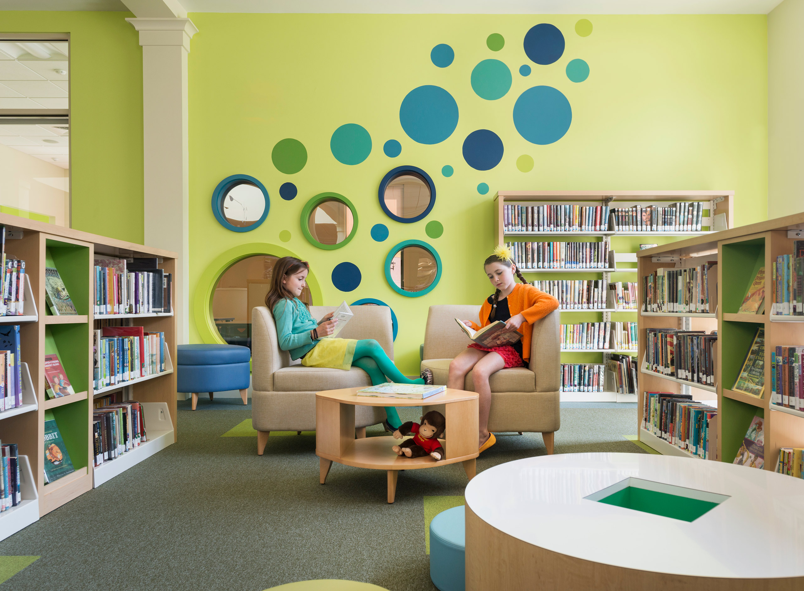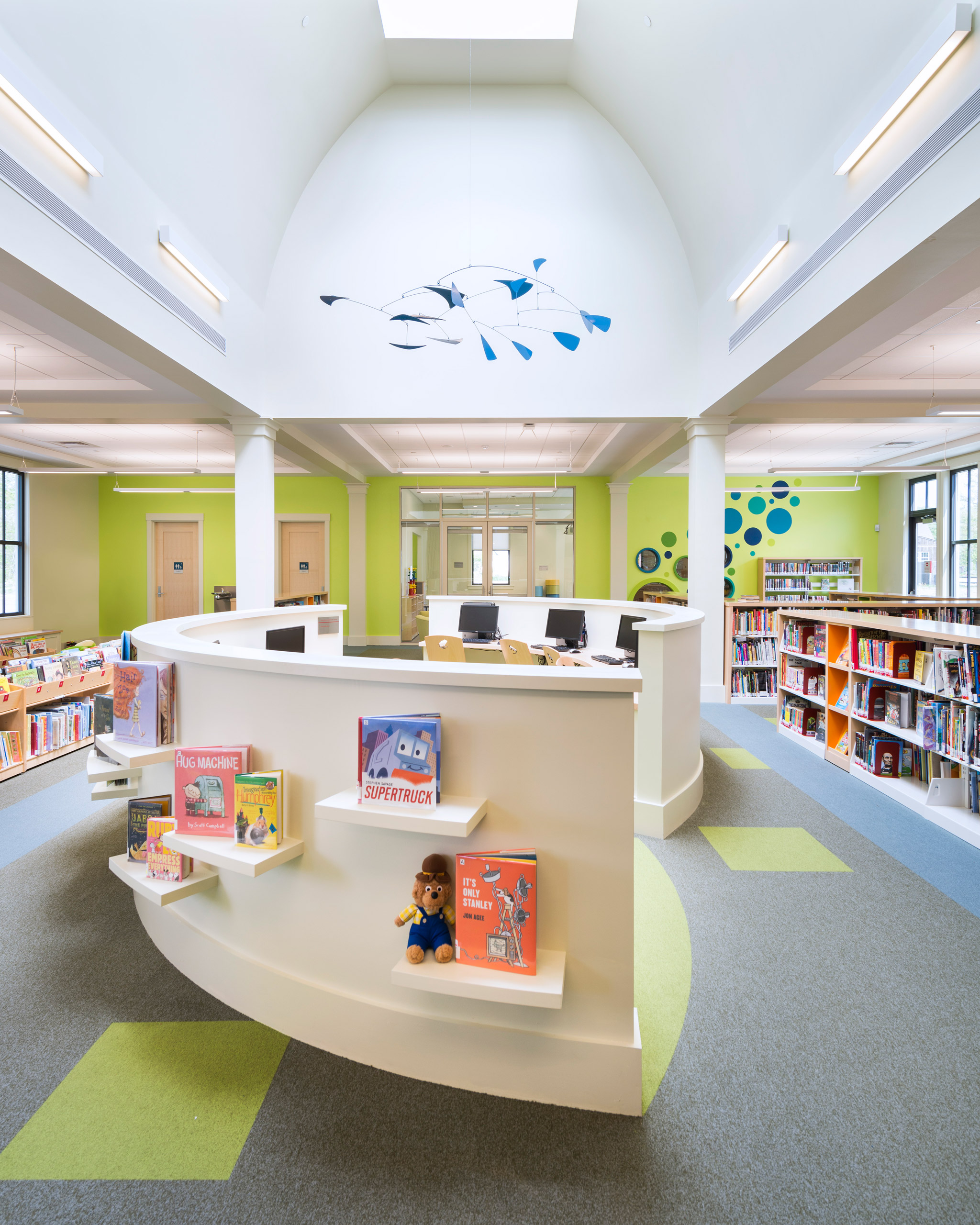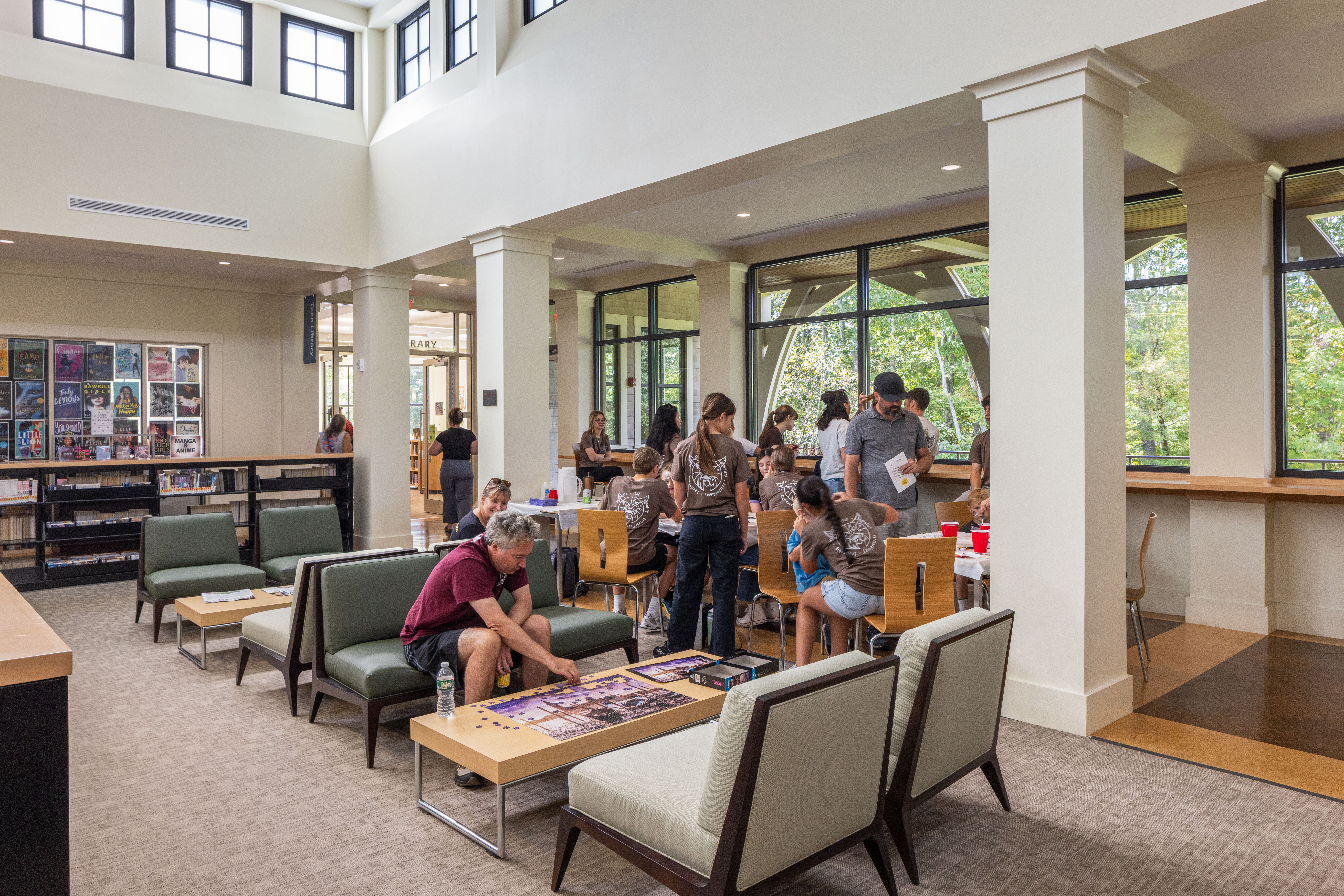 Union designed both the building and its custom furnishings, crafting specialized computer stations, service points, and displays. The library’s strategic location connects it to existing community assets—adjacent recreational fields and a mixed-use arts cooperative (both Union projects), plus nearby middle and high schools—establishing it as the town’s vibrant focal point.